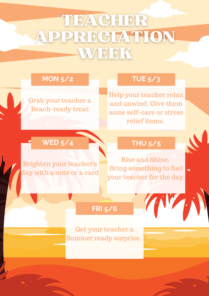 2) Staff Appreciation Week is May 2nd – May 6th. Please see the attached flyer for the daily ideas we have to celebrate the staff at Sanderlin. Please consider sending in something related to our theme for your child’s teacher during the week of May 2nd – 6th.