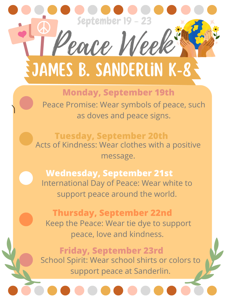 2) Please see the attached daily peace activities for your child to participate in. In addition to the attached, we will be doing various things all throughout the week to focus on Peace. Please keep your eye out for pics on Dojo!
